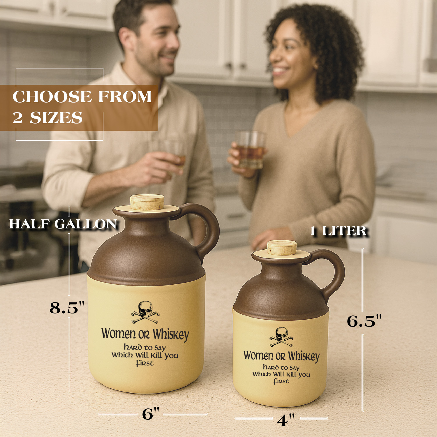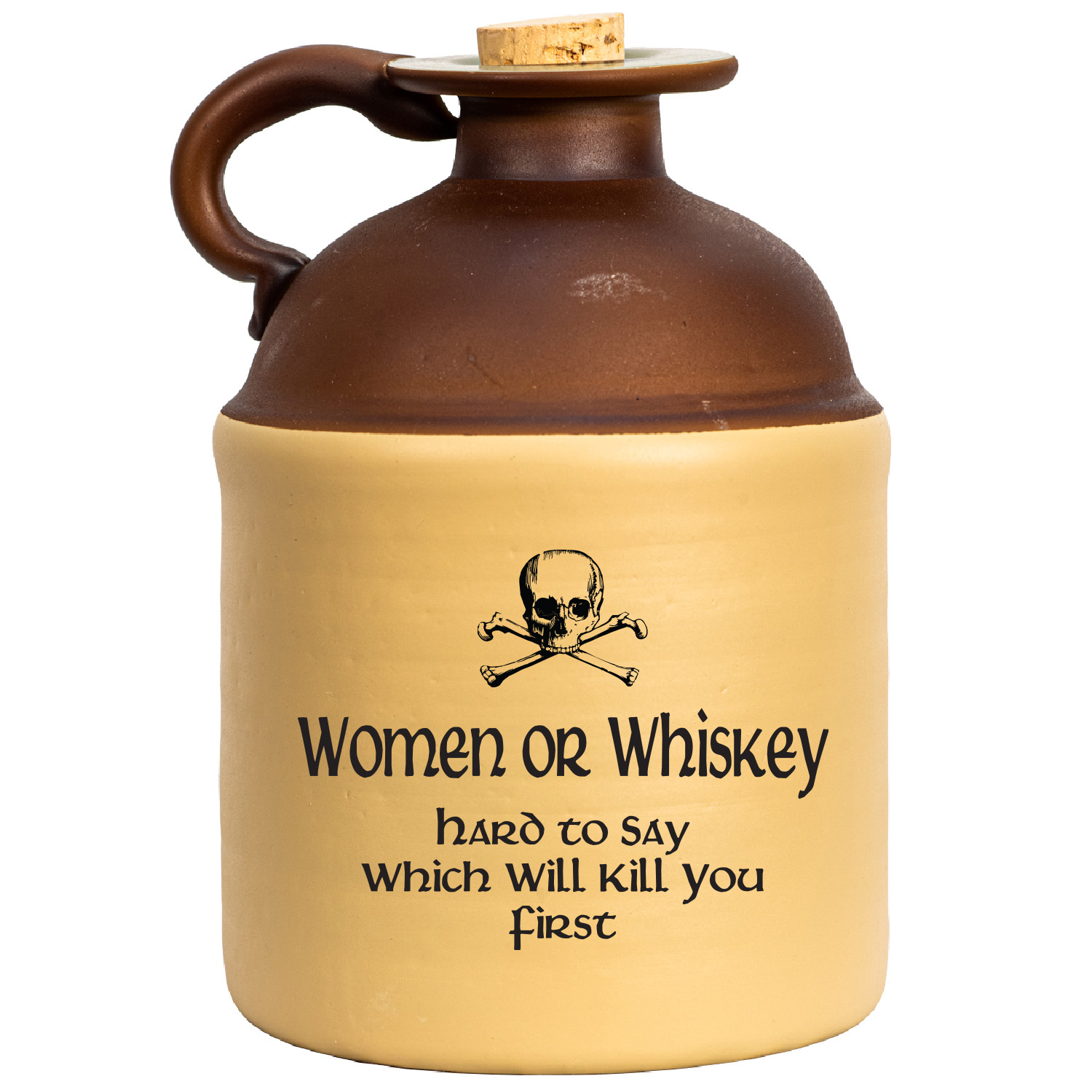Introducing the Women or Whiskey Moonshine Jug — a rustic, vintage-style ceramic jug that blends humor, heritage, and handcrafted charm. This classic whiskey jug features an old-school cork topper, distressed brown glaze, and bold skull-and-crossbones artwork paired with the playful phrase, “Women or Whiskey… Hard to Say Which Will Kill You First.” Perfect for home bars, man caves, rustic décor, and collectors of Americana, this jug captures the outlaw spirit of traditional moonshiners and the rebellious character of bootleg culture. Whether used as a unique bar accessory, decorative display piece, or unforgettable gift for whiskey lovers, bourbon drinkers, or anyone with a sense of humor, this jug stands out as both a conversation starter and a nod to vintage Southern charm. Add personality, nostalgia, and a touch of mischief to any space with this standout moonshine jug.