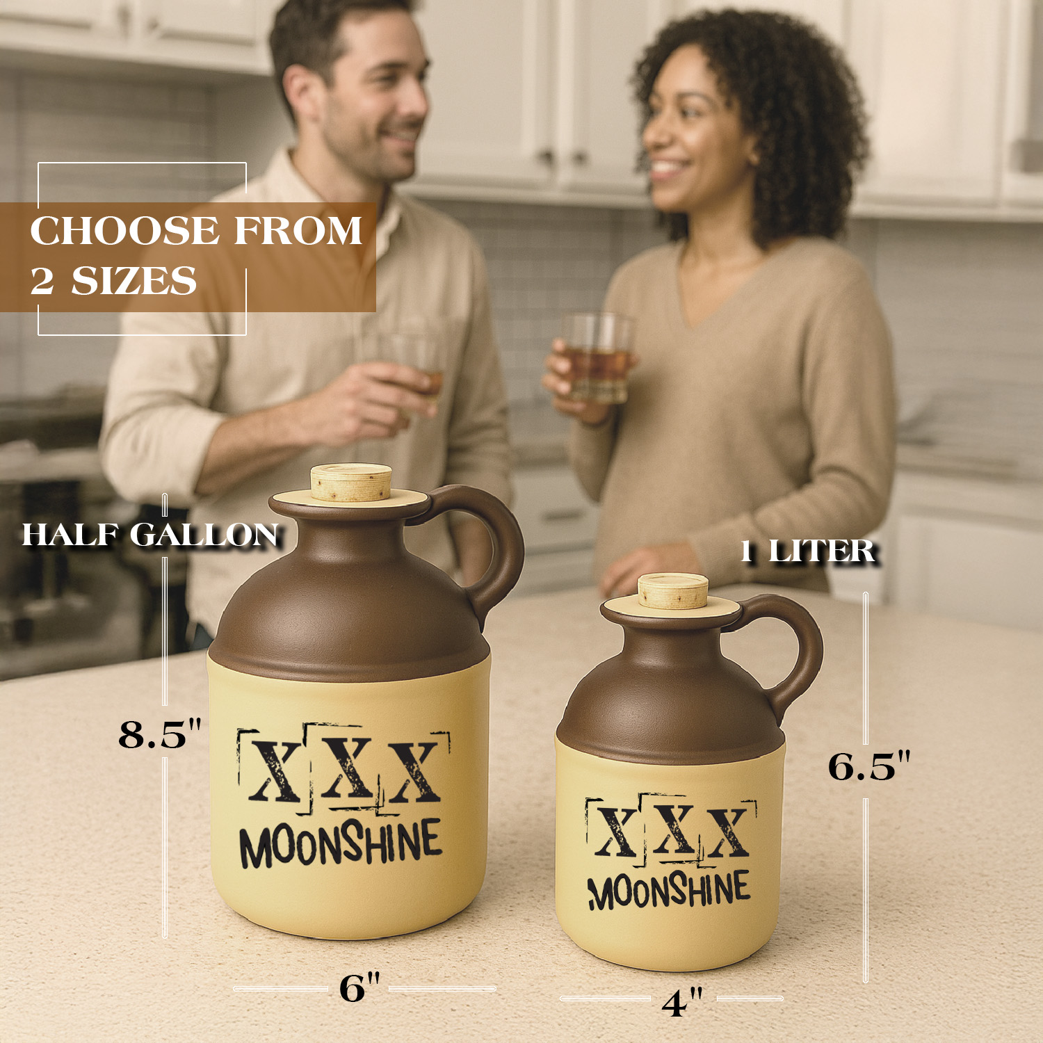 This classic moonshine jug is crafted from durable glass but designed to perfectly mimic the look of a traditional ceramic-style XXX jug, making it a standout piece for collectors, rustic décor lovers, and home bar enthusiasts. Featuring a warm tan body, rich brown top, and sturdy side handle, it captures the authentic charm of an old-fashioned moonshine bottle. The bold “XXX MOONSHINE” graphic enhances its vintage appeal, creating the ideal rustic liquor jug for display or themed events. A natural cork stopper completes the traditional look while keeping contents secure. Whether you’re searching for a vintage-style moonshine jug, a unique whiskey jug accent, or a decorative piece for a farmhouse, cabin, or speakeasy-inspired bar, this glass moonshine jug offers the perfect blend of nostalgia and modern craftsmanship. Great for gifting or collecting, it brings the spirit of classic Appalachian moonshine tradition into any space.