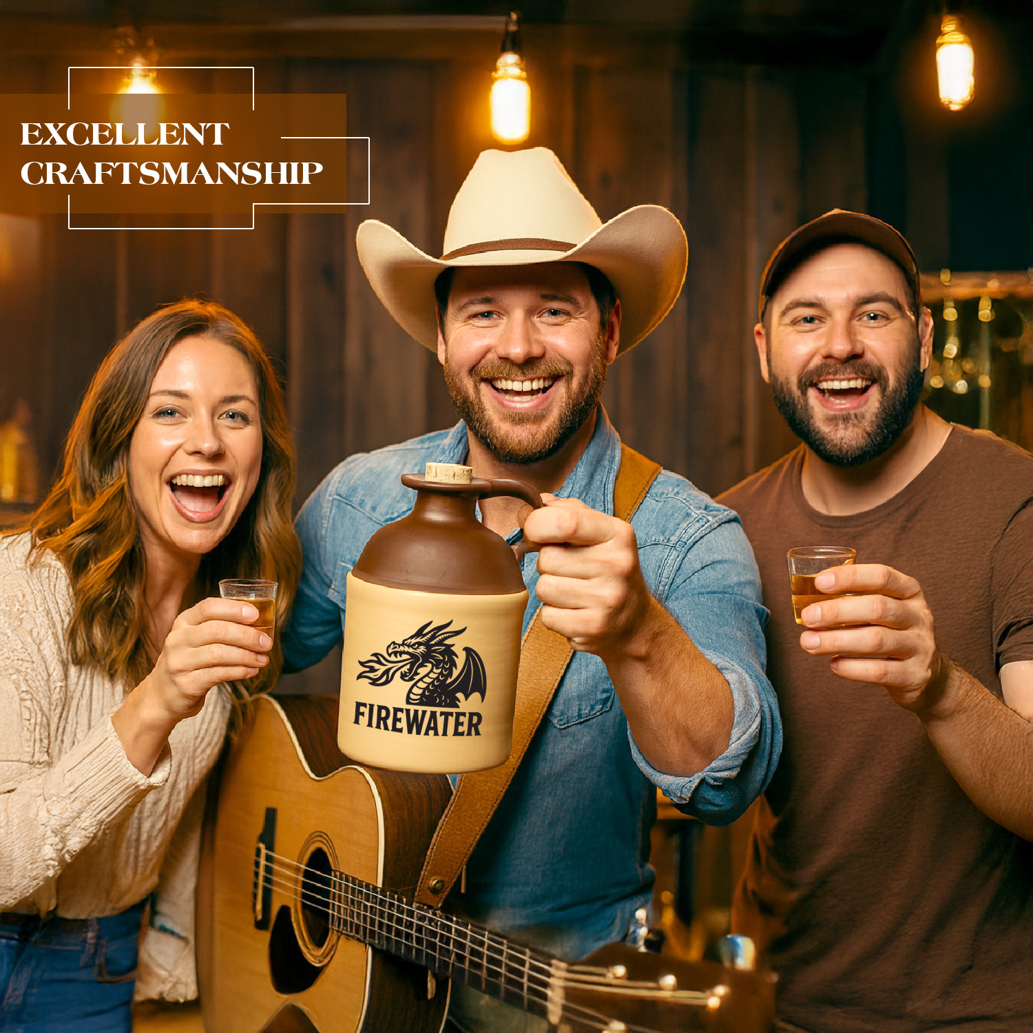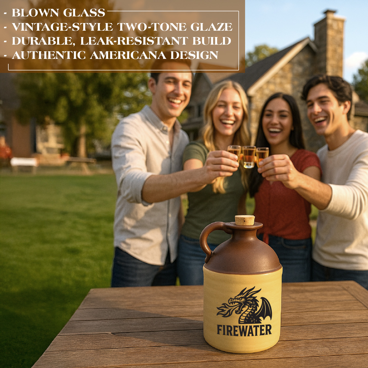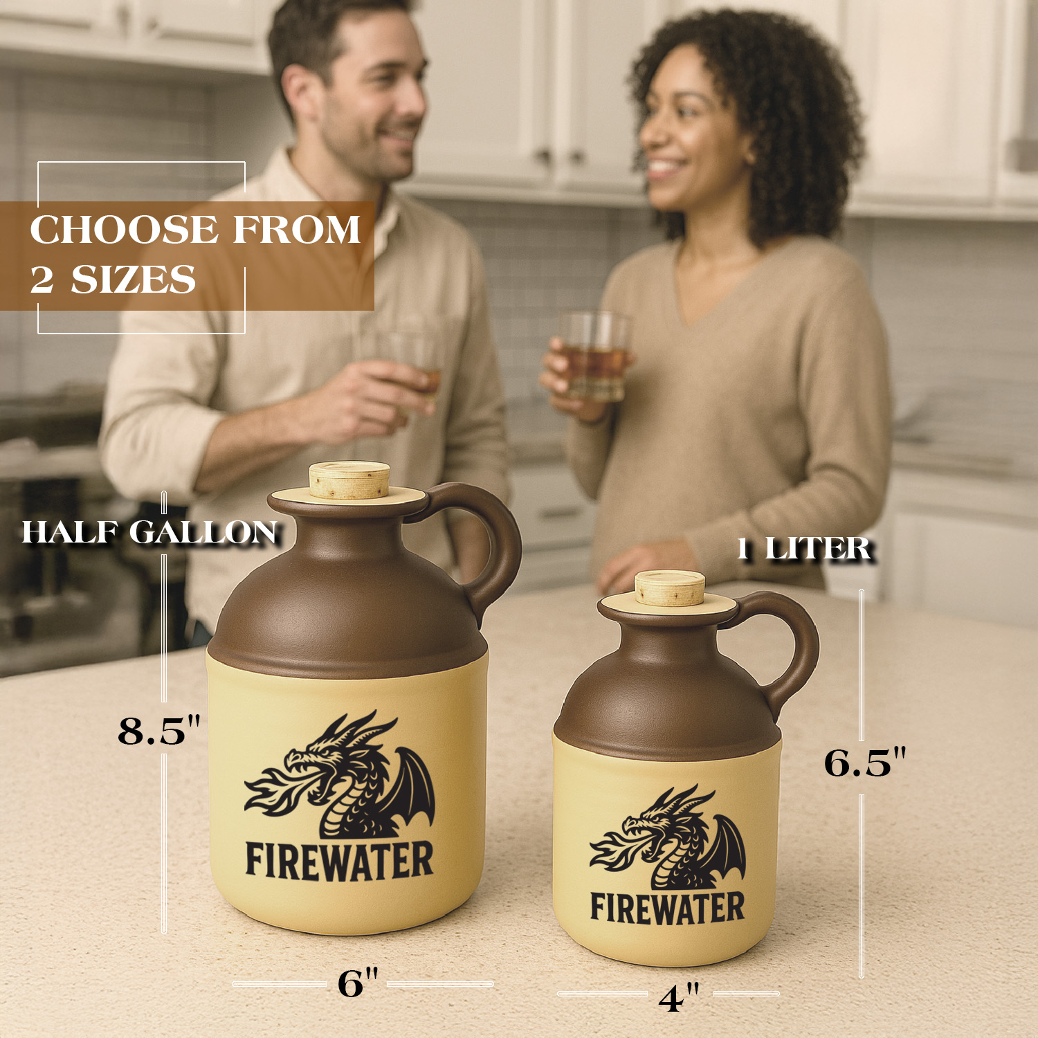 This Firewater Dragon Moonshine Jug is a bold tribute to classic bootlegging heritage, handcrafted style, and fiery attitude. Featuring a striking black-and-white fire-breathing dragon logo and the bold “FIREWATER” imprint, this jug captures the spirit of old-world distilling with a modern, stylized edge. The two-tone ceramic jug blends rustic charm with durable craftsmanship, making it perfect for storing homemade spirits, whiskey, or decorative display in a bar, man cave, or cabin. Ideal for collectors, moonshine enthusiasts, and lovers of unique handcrafted décor, this jug becomes an instant conversation piece. Whether used as a functional moonshine container or a standout gift, the Firewater Dragon Jug delivers authentic vintage character with a fierce, iconic design. Bring unforgettable style to your distilling setup or shelf with this rugged, dragon-themed moonshine jug.
