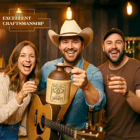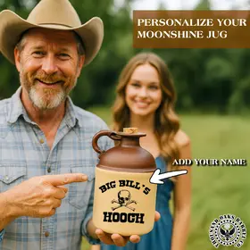 This personalized moonshine jug brings classic rustic charm together with custom craftsmanship. Designed in the style of a traditional XXX ceramic style jug, it features a smooth two-tone finish with a rich brown top, warm tan base, and a sturdy side handle. Your custom name, date, or message is professionally printed on the front, creating a unique keepsake perfect for gifting or display. Complete with a natural cork stopper, this jug blends vintage appeal with modern personalization. Ideal for home bars, décor, weddings, and special occasions, it captures the timeless spirit of old-fashioned moonshine tradition with a meaningful, custom touch.
