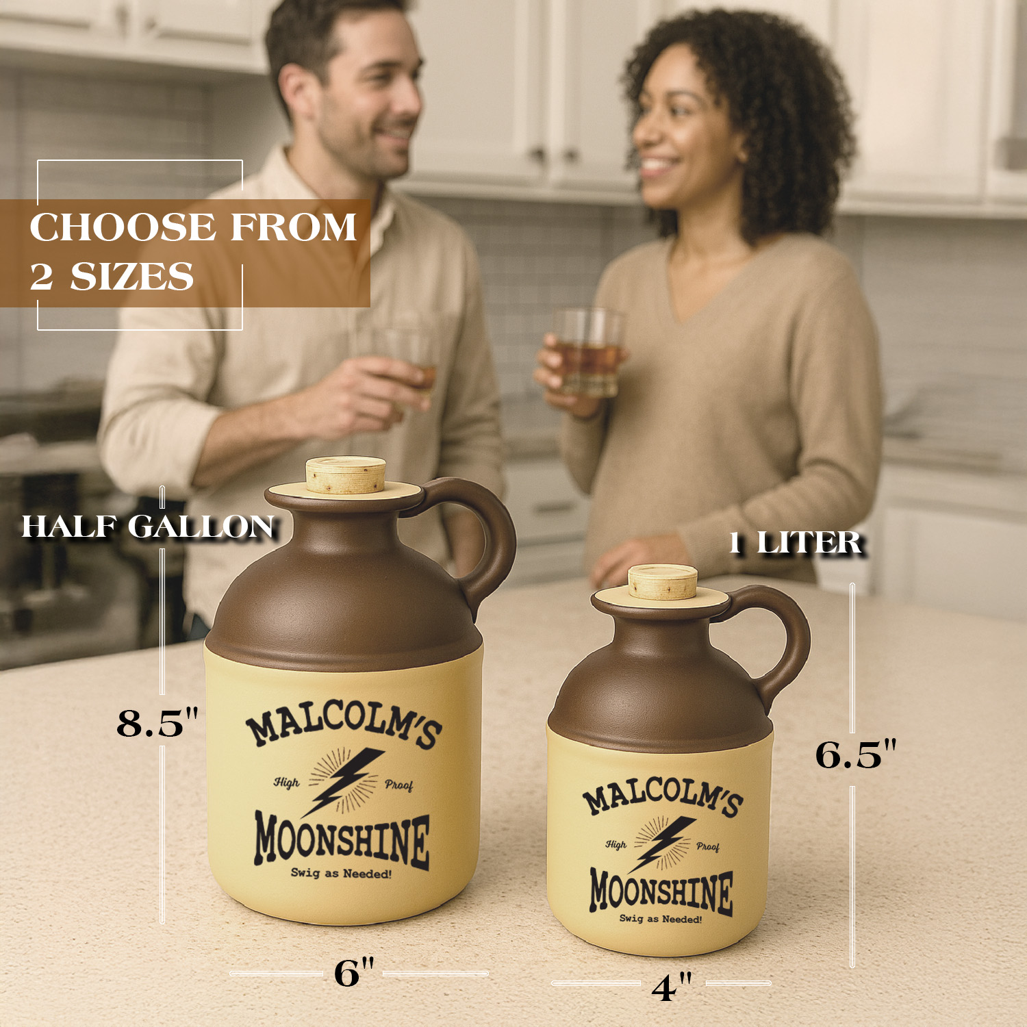 This personalized glass moonshine jug is a charming blend of rustic character and handcrafted appeal, perfect for anyone who appreciates old-fashioned style with a personal touch. Featuring a classic two-tone design with a rich brown top and warm beige base, the jug captures the spirit of traditional distilling vessels while offering modern durability. The bold, vintage-inspired “Custom Moonshine” label—complete with lightning bolt graphic and playful phrases like “High Proof” and “Swig as Needed!”—adds personality and authenticity, making it an eye-catching display piece as well as a functional container. The sturdy handle ensures easy pouring, and the natural cork stopper completes the nostalgic look. Ideal for gifting, home bars, themed parties, or collectors of Americana décor, this jug brings a touch of humor and heritage to any setting. Customize it with a name to create a memorable keepsake that stands out with charisma and charm.