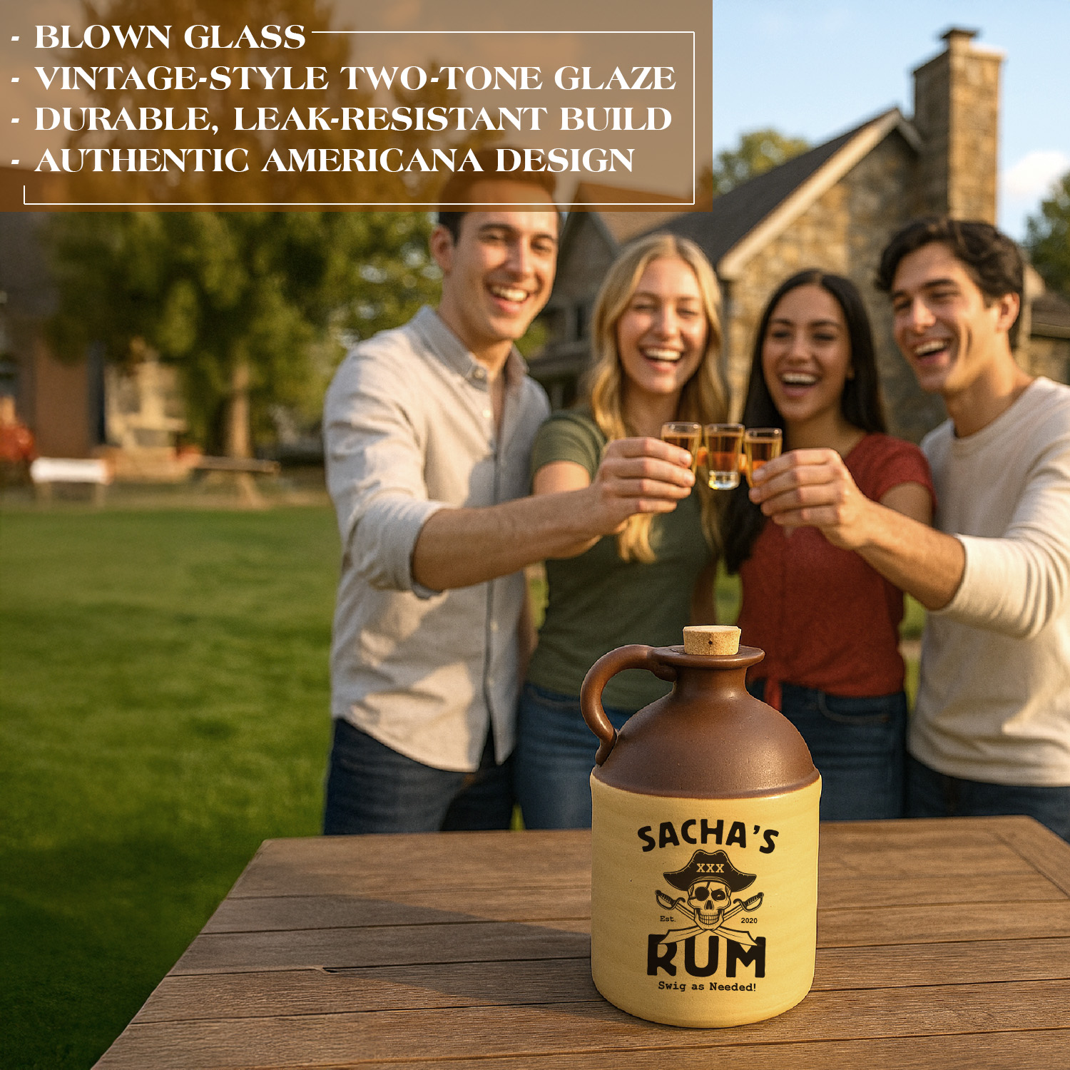 Raise a toast to bold flavor and frontier spirit with this Personalized Moonshine Jug, custom-designed with a pirate-themed “Sacha’s Rum” label that brings vintage charm to any bar, man cave, or home display. Crafted to resemble classic stoneware jugs of the Old West, this collectible rum jug features a rugged two-tone finish, a sturdy handle, and an authentic cork top. The striking skull-and-crossed-cutlasses artwork makes it the perfect gift for rum lovers, home distillers, or anyone who appreciates handcrafted décor. Whether used as a statement piece, party prop, or unique keepsake, this custom moonshine jug adds character and personality to any setting. Ideal for birthdays, anniversaries, Father’s Day, groomsmen gifts, or themed events. Celebrate your favorite swashbuckler with a fun, memorable bar accessory that’s sure to spark conversation. Customize yours today and bring pirate attitude to your home bar.